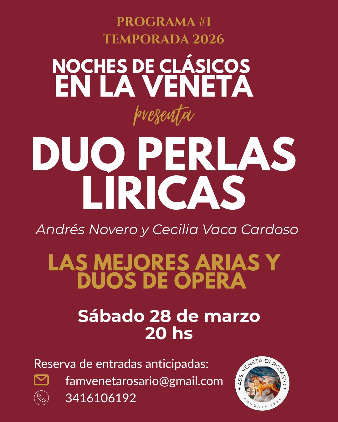La Asociación Familia Veneta de Rosario abre su ciclo “Noches de Clásicos” con la presentación del Dúo Perlas Líricas. La propuesta busca acercar la música académica al público local.