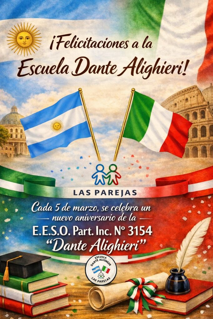 El 5 de marzo de 2026, la Escuela de Enseñanza Secundaria Orientada Particular Incorporada Nº 3154 “Dante Alighieri” de Las Parejas conmemoró su 17° aniversario, una fecha que cada año es acompañada por saludos institucionales y menciones especiales de la municipalidad en redes sociales para reconocer la labor de la comunidad educativa.